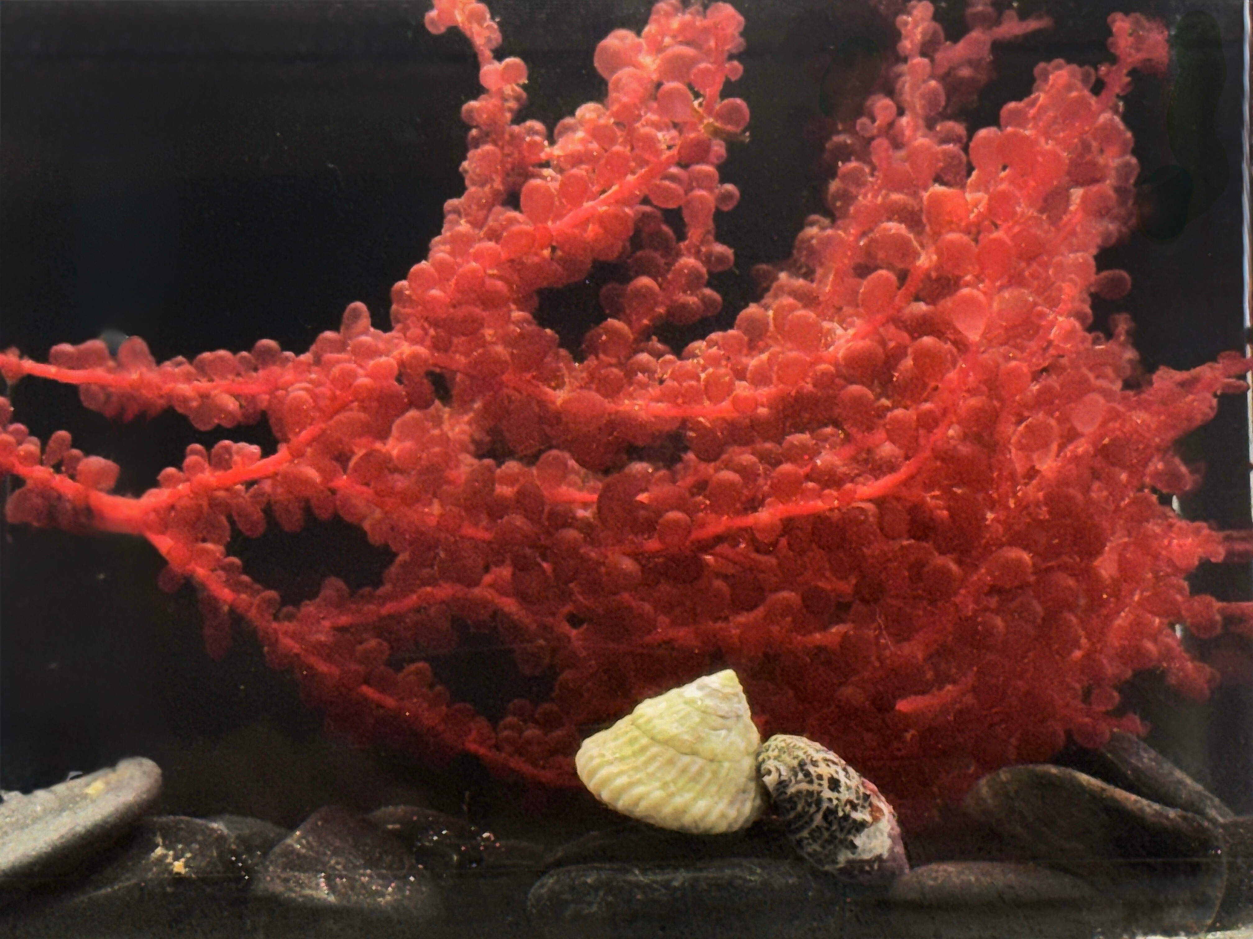 A bold, sculptural red macroalga collected offshore in the Gulf of Mexico, typically from ledges and hard-bottom habitat at 30–60 ft. Its signature look comes from bright red, grape-like bladders clustered along lightly calcified branches. Once anchored, it becomes a striking focal point in reef and lagoon-style aquascapes.