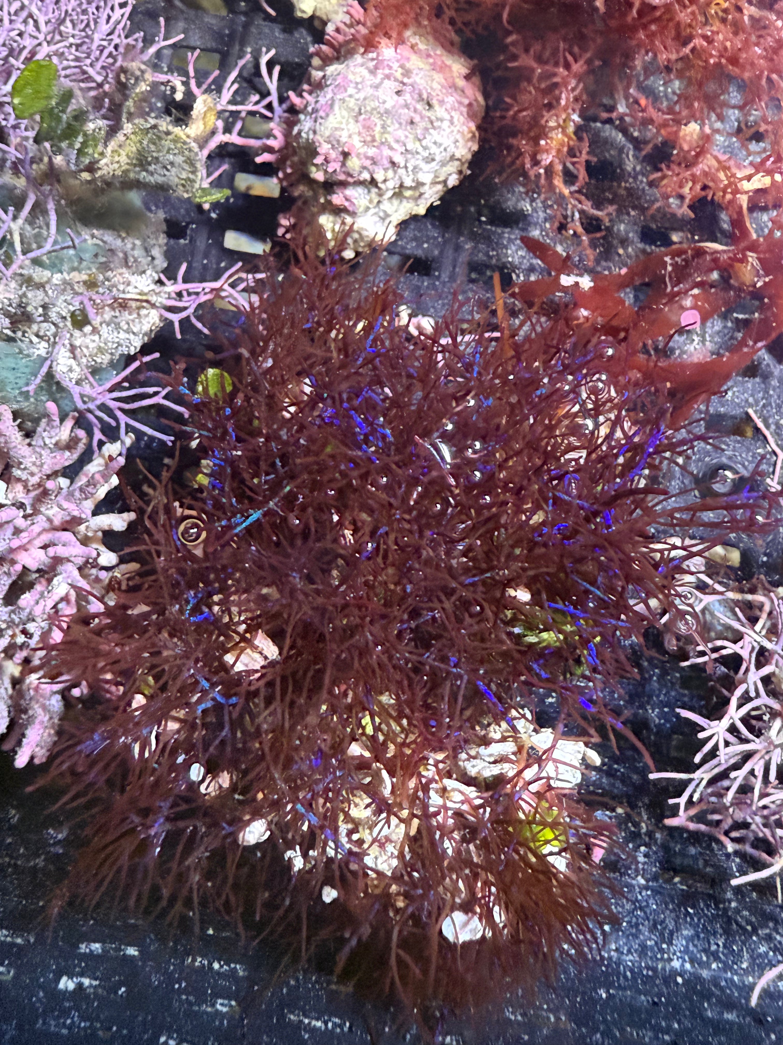 Coelothrix Spark Algae is a vividly colored, turf-style red macroalga known for its electric sheen and compact, tufted growth. Depending on lighting and collection depth, its base color may appear reddish brown, pale purple, or olive green. Under high or aquarium lighting, it frequently flashes iridescent blues and greens that look almost electrified.