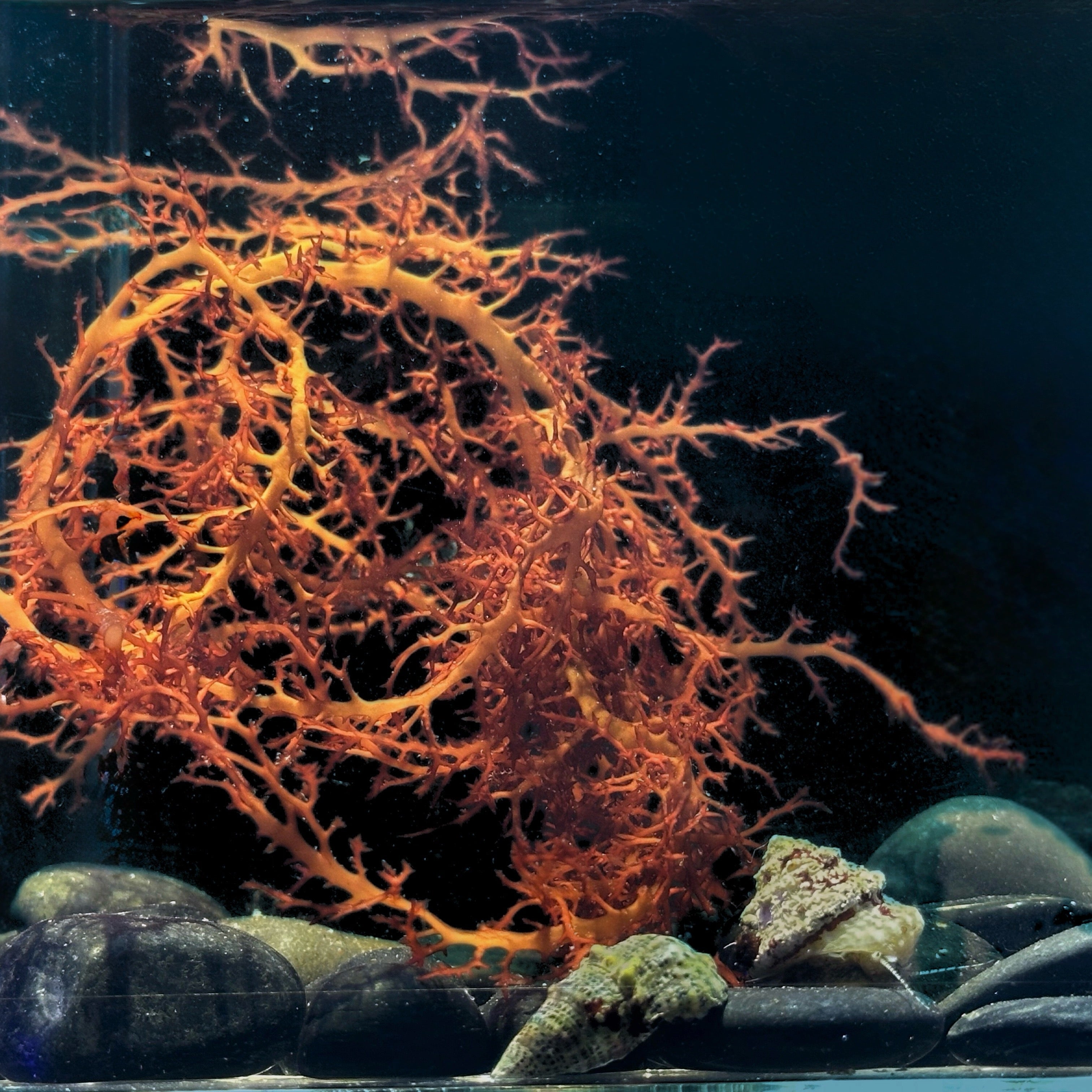 A semi-rare red macroalga with fronds shaped like underwater lace. Portieria forms delicate, branching tufts with patterned tips that ripple in the current and add fine, intricate texture to the aquascape.
