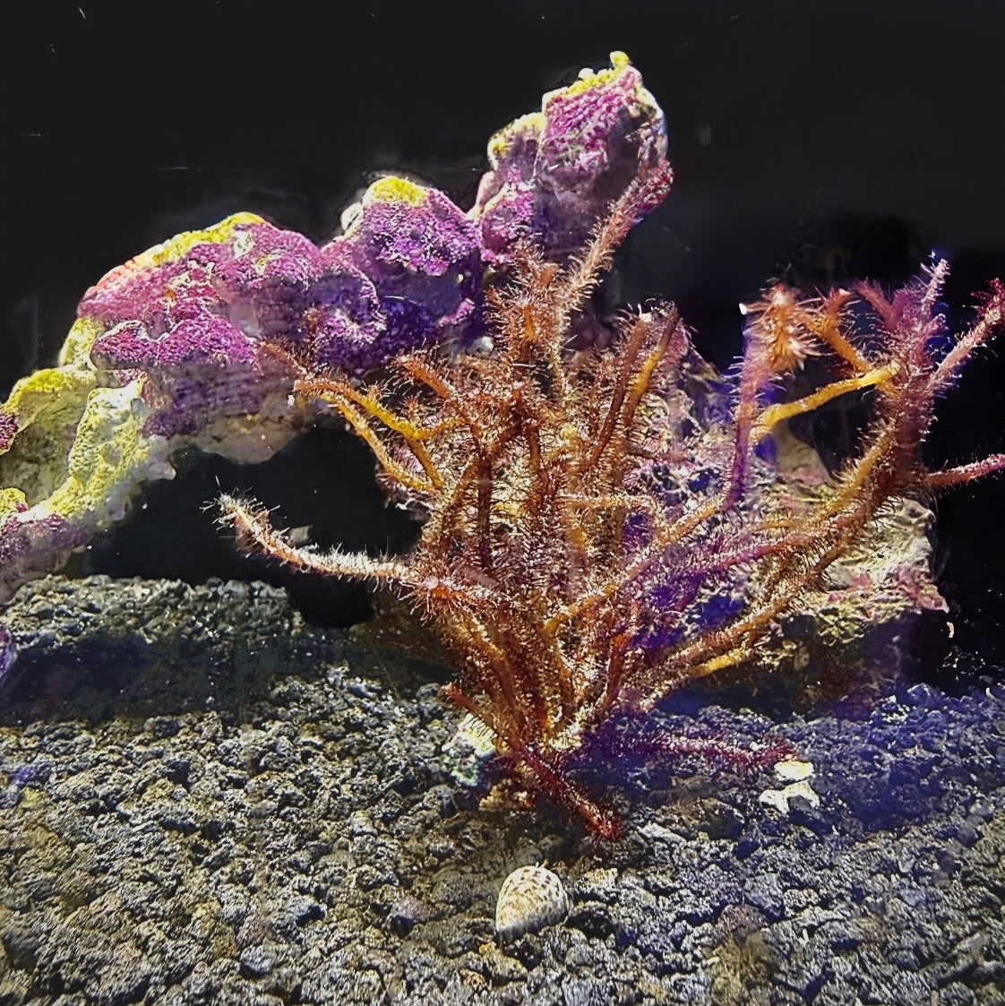 In the wild it forms loose clusters that sway gently in coastal currents, often anchored to rock or rubble in shallow tropical waters. In the aquarium it brings movement, height, and a clean pop of crimson that stands out beautifully against greens and neutrals.
