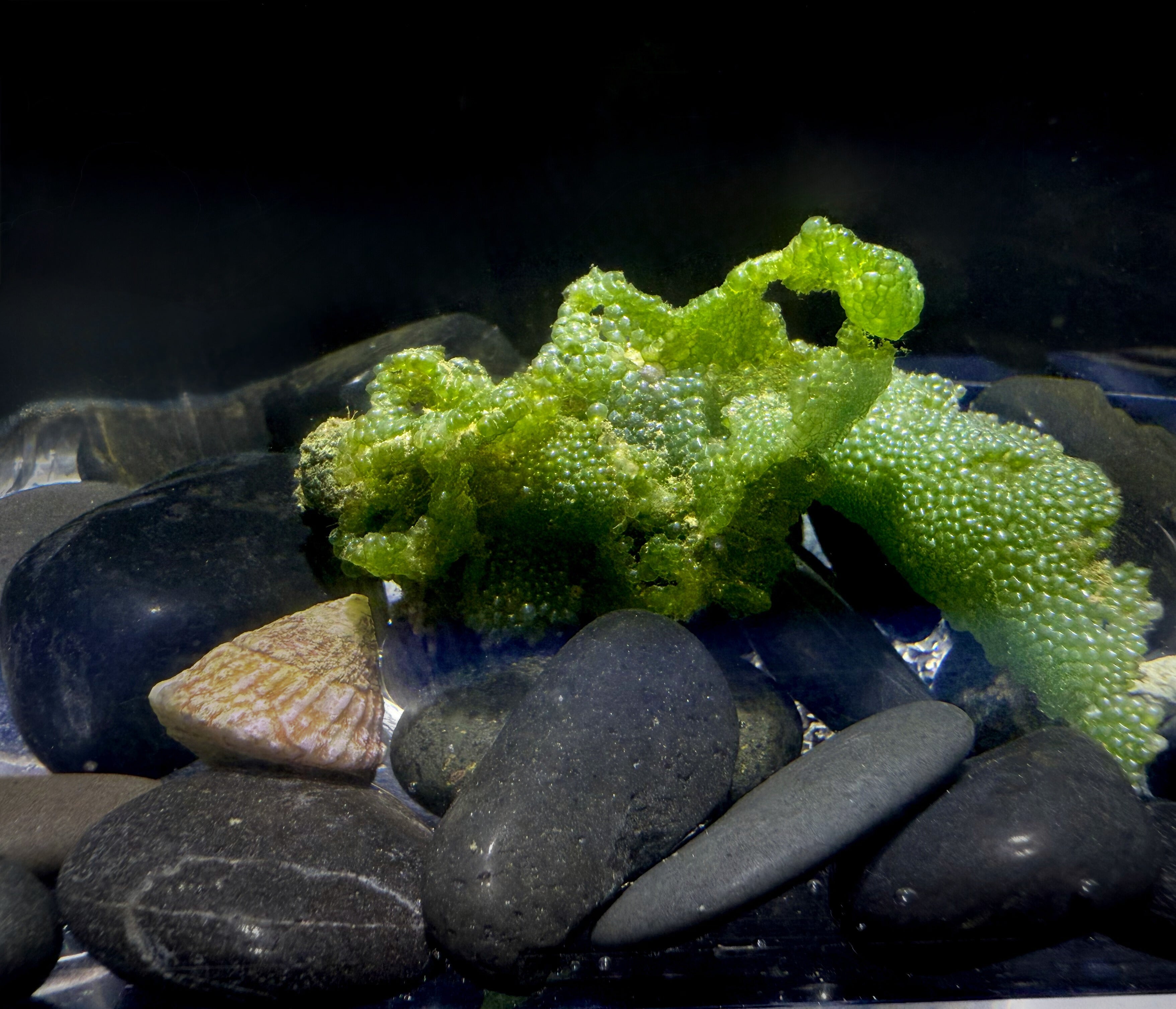 Many species may arrive paler or whitish in color. This is completely normal. Macroalgae shift their pigments inward during transport to protect from light and stress, and color usually returns within a few days under good aquarium lighting and flow.